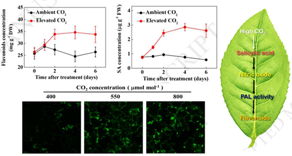 CO2濃度升高作為氣候變化的一個(gè)重要方面,將直接影響作物的產(chǎn)量和品質(zhì)。茶樹栽培團(tuán)隊(duì)前期研究證實(shí),CO2濃度升高對(duì)茶樹葉片中的兒茶素等品質(zhì)成分代謝也有著重要影響,而關(guān)于其調(diào)控機(jī)理尚不清楚。此次研究發(fā)現(xiàn),CO2濃度升高能夠顯著提高茶樹葉片中類黃酮物質(zhì)的含量,同時(shí)葉片中的水楊酸和一氧化氮等信號(hào)物質(zhì)的含量也會(huì)相應(yīng)提高。此外,該研究證實(shí)外源水楊酸和一氧化氮也能夠誘導(dǎo)類黃酮物質(zhì)的累積,而利用化學(xué)手段抑制水楊酸和一氧化氮合成可以抑制CO2濃度升高誘導(dǎo)的類黃酮物質(zhì)合成。上述結(jié)果表明,水楊酸和一氧化氮信號(hào)途徑介導(dǎo)了CO2濃度升高對(duì)茶樹類黃酮合成代謝的調(diào)控。在此基礎(chǔ)上,研究還證實(shí)水楊酸信號(hào)作用于一氧化氮信號(hào)途徑的上游。