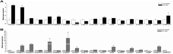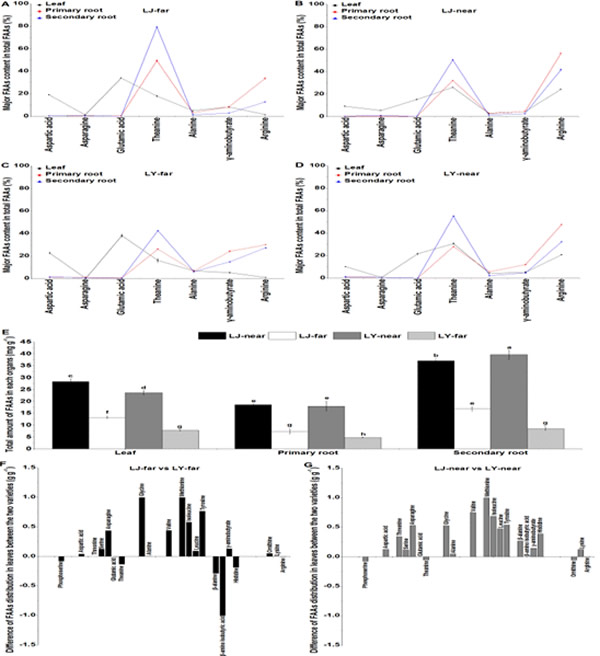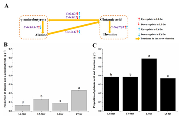 通過根系形態、氨基酸和氮素相關基因表達分析,評價了不同茶樹品種對土壤氮空間異質性的響應機制。在雙行雙株側窩種植模式下,不同茶樹品種對土壤氮空間異質性的適應能力不同。氮高效品種主要通過:優先發育二級根系、氮素向葉片的轉運、重要的氨基酸(茶氨酸、谷氨酸、γ-氨基丁酸和丙氨酸)相互轉化來提高對氮素空間異質性的適應能力。參與將γ-氨基丁酸、丙氨酸向茶氨酸、谷氨酸方向轉化的基因(CsGABA-T和CsAlaAT)在氮高效品種中上調,在低效品種中下調;而參與將茶氨酸、谷氨酸向γ-氨基丁酸、丙氨酸轉化的基因(CsGAD1和CsGAD2)在氮高效品種中下調,在低效品種中上調。另外,參與氮運輸和同化的基因(CsGS2和CsNRT2.5)在氮高效品種中上調,在低效品種中下調。