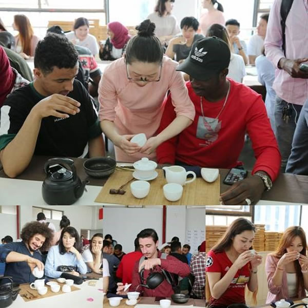 本次講座分為茶藝知識講授和茶文化體驗兩個環節。講座上,周老師用豐富的茶藝知識,樸實幽默的語言向留學生們介紹了茶的分類、制茶的工藝與沖泡技法。在文化體驗環節,周老師演示了泡好一杯茶的簡單方法,讓留學生們親手沖泡并品嘗了六大茶類,從視覺、嗅覺和味覺三方面體驗并享受茶文化。國際學生端著茶杯細細觀察茶湯顏色,輕嗅茶的香味,品味茶的口感,并主動與周老師請教茶藝、茶道、茶禮的相關知識。來自阿爾及利亞的塔哈激動地表示:“我們國家有很多人喜歡喝中國茶,但是在那里能買到的茶的品種比較少。來到中國后,我也愛上了中國茶。這次講座讓我讓大開眼界,我不僅知道了更多茶的種類,還知道了別人給我倒茶時,我可以輕叩手指表達感謝。”