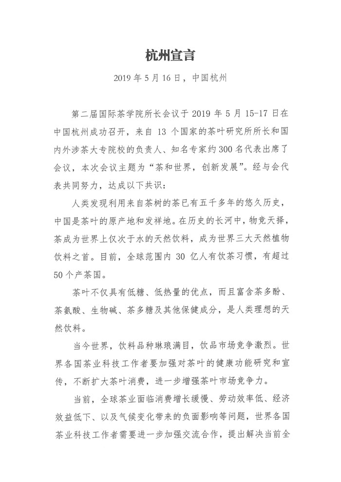 來自13個國家的茶葉研究所所長達成共識,形成并發(fā)布了《杭州宣言》。各國茶葉科技工作者要加強對茶葉的健康功能研究和宣傳,不斷擴大茶葉消費,進一步增強茶葉市場競爭力。同時,要進一步加強交流合作,建立多邊茶業(yè)科技交流與磋商機制,共同謀劃國際合作項目,提出解決當前全球茶產(chǎn)業(yè)面臨諸多挑戰(zhàn)的方案。商定今后每兩年舉辦一次國際茶學院所長會議,把國際茶學院所長會議打造成為交流國際最新茶業(yè)科技創(chuàng)新成果的重要平臺,促進全球茶葉科技進步。