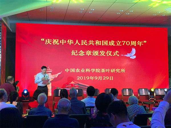 9月29日下午,我所隆重舉行“慶祝中華人民共和國成立70周年”紀念章頒發(fā)儀式,會議由副所長魯成銀主持。所黨委書記姜仁華同志,中國國際茶文化研究會常務(wù)副會長、杭州市人民政府原市長孫忠煥先生頒發(fā)紀念章,并向紀念章獲得者表示熱烈祝賀和崇高敬意。所領(lǐng)導(dǎo),特邀嘉賓及全所職工、離退休老同志近300人參加頒發(fā)儀式。