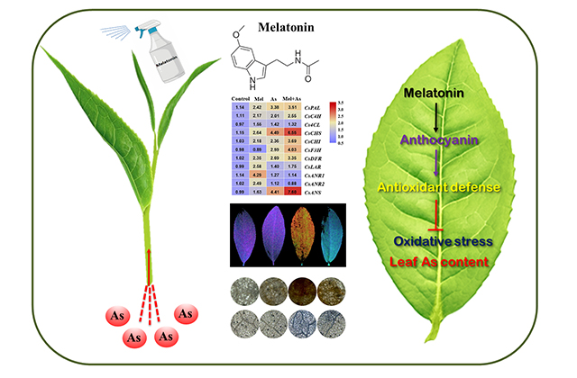 砷是一種廣泛存在于自然界的微量元素,有劇毒并且有致癌作用,能夠通過植物積累進入動物和人的體內,從而威脅人體健康。在本研究中,研究人員發現過量的砷會顯著降低茶樹葉片光合系統II的最大光化學效率,增加活性氧的積累和脂質過氧化程度,從而誘發茶樹葉片中劇烈的氧化應激反應。而通過外源施用褪黑素,能夠選擇性地提高茶樹葉片中花青素生物合成相關基因的表達,促進葉片中花青素積累,從而減輕了砷脅迫對茶樹葉片光系統的影響。同時,通過比較花青素基礎水平具有顯著差異的兩個茶樹品種(龍井43和紫鵑)對砷脅迫的耐受性發現,花青素含量高的茶樹品種紫娟具有比龍井43更強的砷脅迫耐受性。此外,外源施用花青素也能增強龍井43對砷脅迫的耐受性。上述結果表明,褪黑素可能是通過調控花青素合成代謝提高了茶樹對砷脅迫的耐受性。這項研究為茶樹砷脅迫應對和保障茶葉質量安全提供了新的思路,具有重要的研究意義。