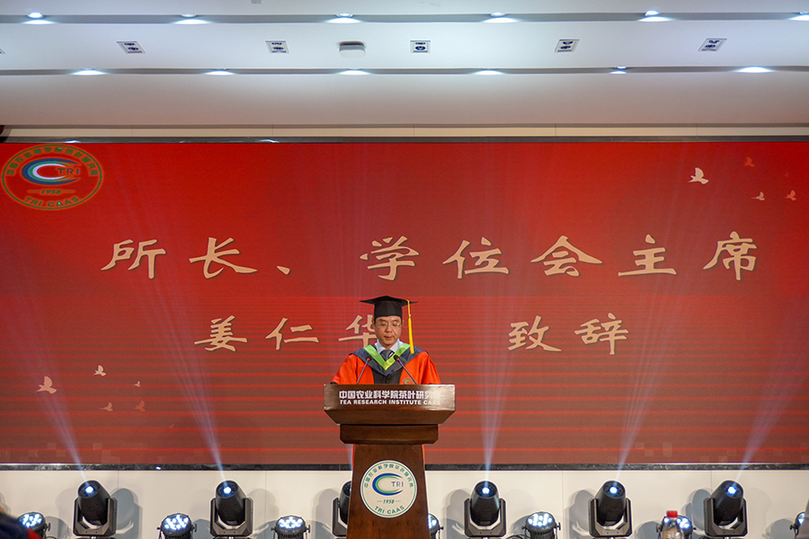 畢業(yè)典禮在莊嚴(yán)的國歌聲中拉開帷幕。所長、學(xué)位評定委員會主席姜仁華致辭,他代表所領(lǐng)導(dǎo)班子、全體導(dǎo)師和全體職工對畢業(yè)生們圓滿完成學(xué)業(yè)、踏上人生新征程表達(dá)最美好的祝福。他指出,2024屆畢業(yè)生是見證祖國一個個令人自豪的高光時刻,親歷茶葉所改革、創(chuàng)新和發(fā)展,經(jīng)受疫情考驗的一屆。他希望畢業(yè)生們牢記農(nóng)科學(xué)子的使命與擔(dān)當(dāng),做一個敬業(yè)樂業(yè)、學(xué)會思考、明辨是非、充滿激情的人,做一個懂得感恩、正直善良的人,繼續(xù)保持學(xué)習(xí)的動力、保持對新事物的熱情、保持創(chuàng)造快樂的能力,積極開創(chuàng)屬于自己的未來。