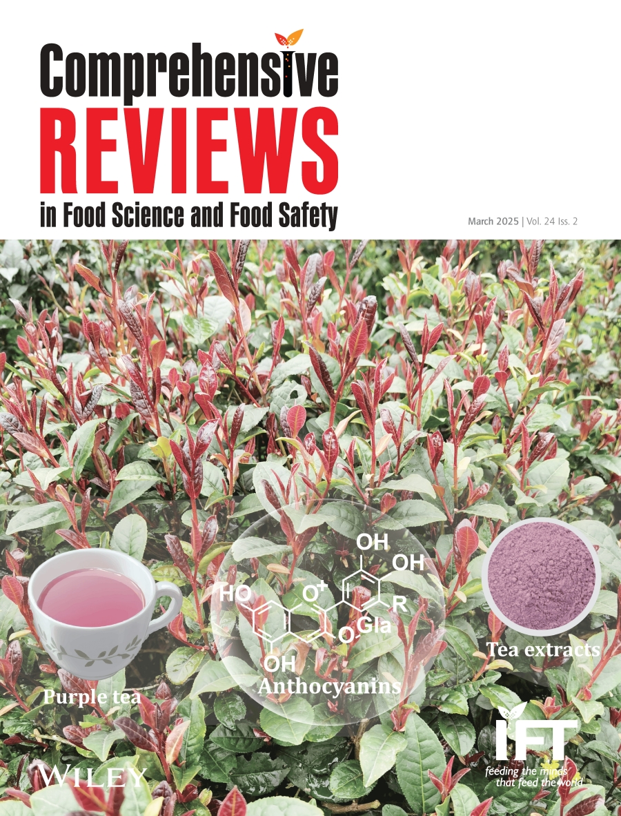 近日,團(tuán)隊(duì)在國(guó)際期刊Comprehensive Reviews in Food Science and Food Safety上發(fā)表了題為“A comprehensive review on the promising purple leaf tea”的綜述論文,系統(tǒng)論述了紫葉茶的化學(xué)成分、加工技術(shù)、健康益處及食品工業(yè)應(yīng)用潛力,為紫葉茶的開(kāi)發(fā)與應(yīng)用提供了參考依據(jù)。此外,還提出了紫葉茶產(chǎn)業(yè)化面臨的一些挑戰(zhàn),指出未來(lái)研究應(yīng)聚焦于優(yōu)化生產(chǎn)工藝、系統(tǒng)評(píng)估健康功能及拓展食品應(yīng)用領(lǐng)域。該論文被遴選為雜志當(dāng)期的封面文章(Featured Cover),封面圖片的設(shè)計(jì)以紫葉茶的自然意象為核心,展現(xiàn)了紫色茶樹(shù)的嫩葉、紫葉茶產(chǎn)品及其提取物等,凸顯了花青素是紫葉茶中重要的品質(zhì)化學(xué)成分。