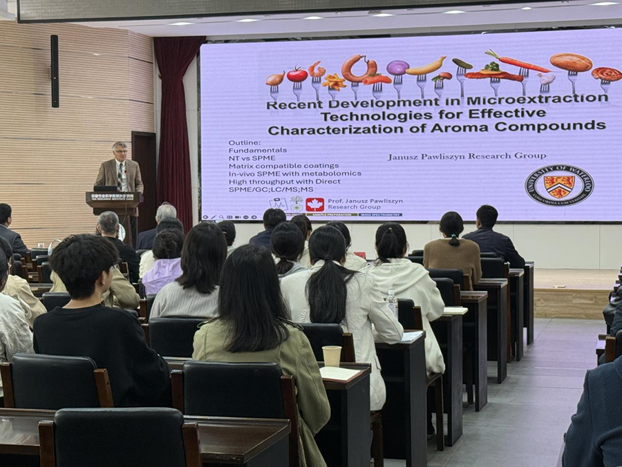 Janusz Pawliszyn教授作了題為“微萃取技術在香氣化合物有效表征方面的最新進展”的學術報告,介紹了固相微萃取(SPME)技術在風味與香氣化合物研究方面的獨特優勢,指出了該技術在處理復雜基質或親水化合物時面臨的挑戰,并介紹了薄膜固相微萃取(TF-SPME)及TF-SPME與傳統SPME纖維的自動化集成技術等創新方法,可提高極性化合物的提取效率,為我所科研人員在香氣化合物表征領域的研究提供了新的思路和方法。